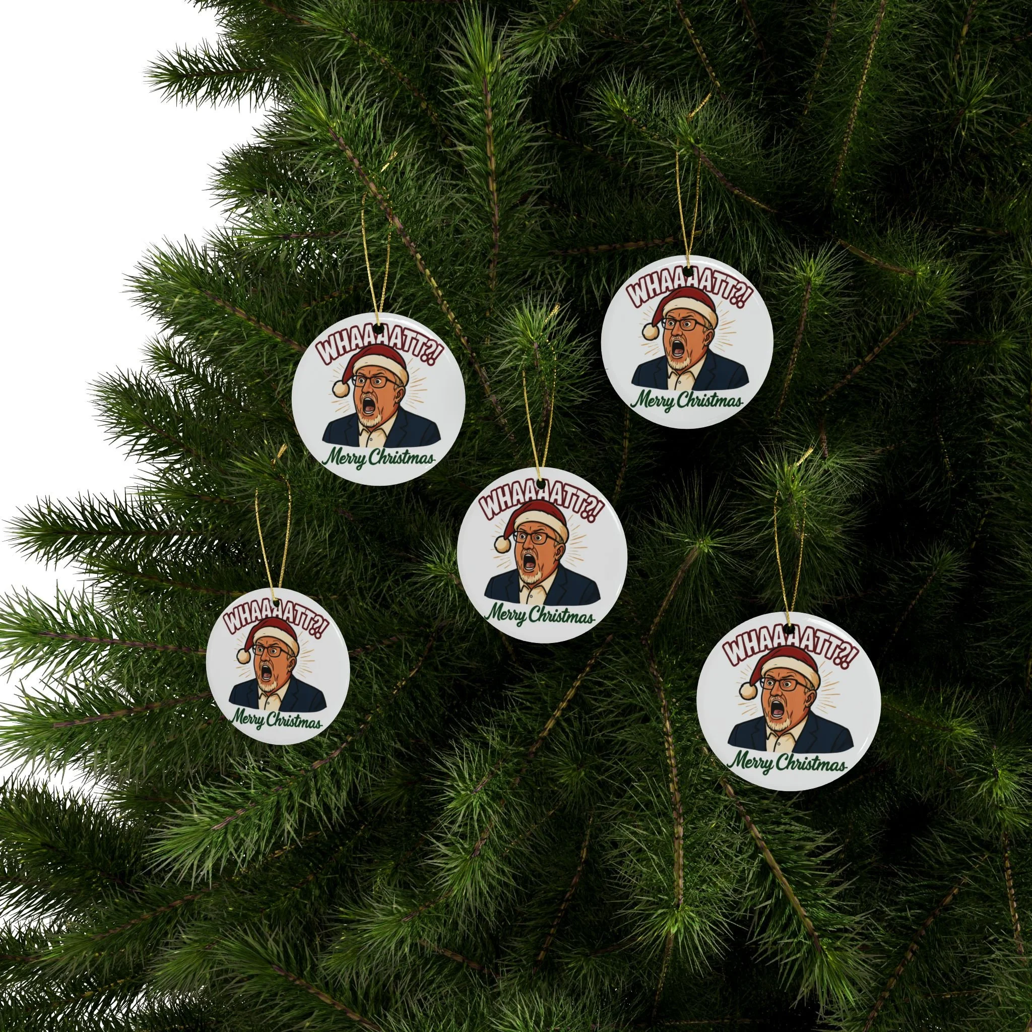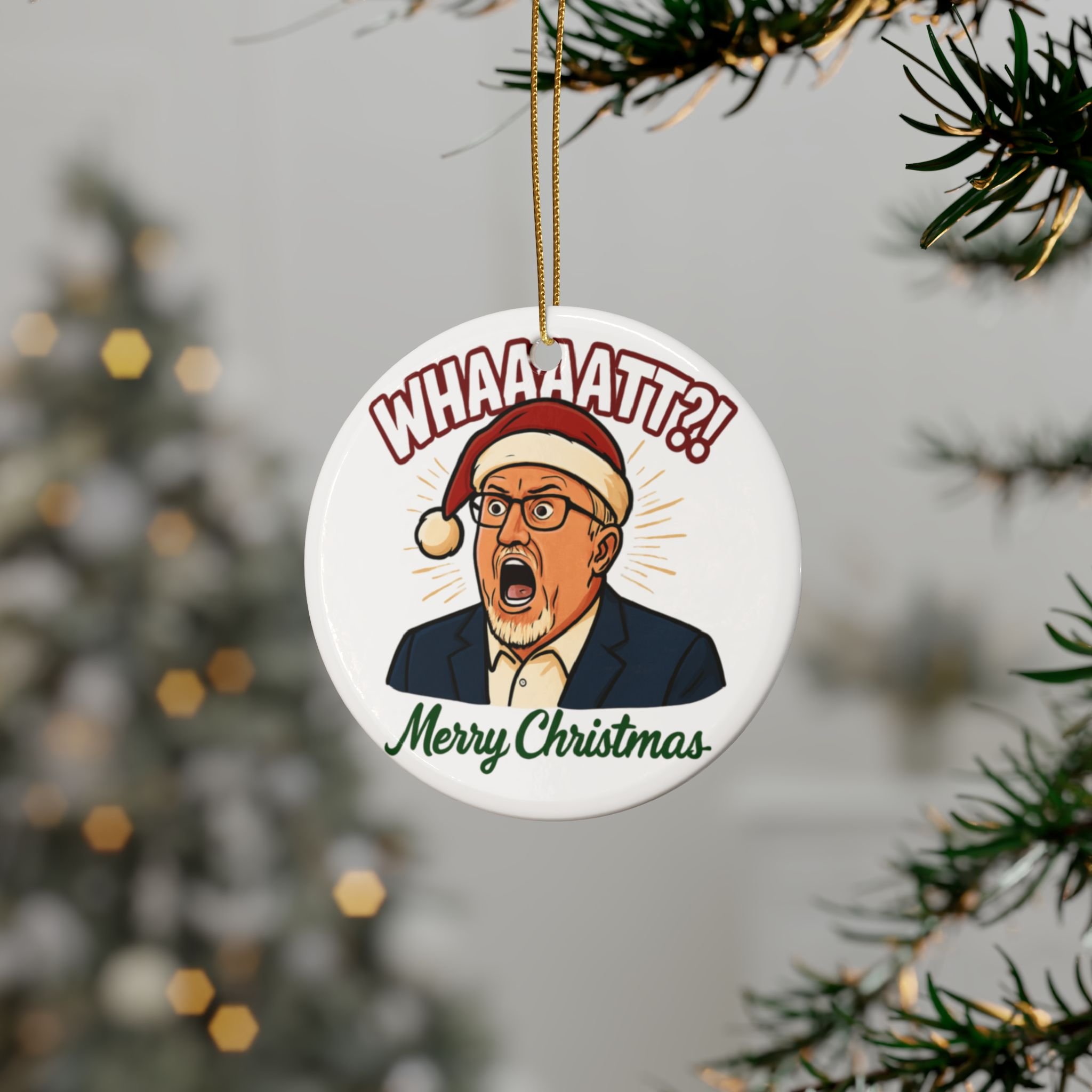 A glossy ceramic ornament that brings loud, joyful humor to holiday trees and seasonal décor. The front-and-back print features Pastor Paul Begley in a Santa hat with the exclamation “WHAAATTT?!” over a warm “Merry Christmas” script — a playful nod to family moments that end in laughter. Lightweight yet sturdy, it hangs from a gold string and reflects light from its glossy finish, adding a bright, cheerful accent to mantels, wreaths, and gift tags. Let it spark conversations and memory-making rituals during cozy gatherings and rowdy holiday dinners.